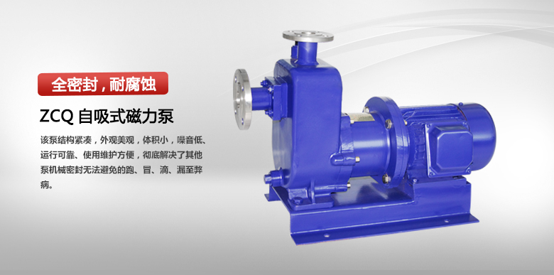 ZCQ型自吸式磁力驱动泵以静密封取代动密封,使泵的过流部件处于全密封状态,解决了其它泵机械密封无法避免的跑、冒、滴、漏之弊病,泵体及过流部件的材料均采用了耐腐蚀的不锈钢、陶瓷、四氟石墨、碳石墨、硬质合金等材料制造,既有CQ型磁力驱动泵的功能,又集自吸于一身,不需底阀和引灌水,即开即抽,轻松方便。